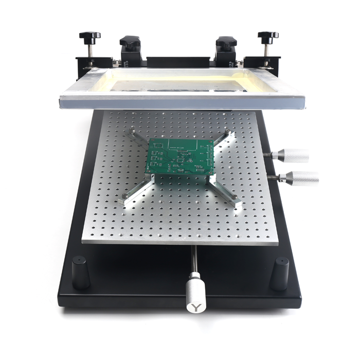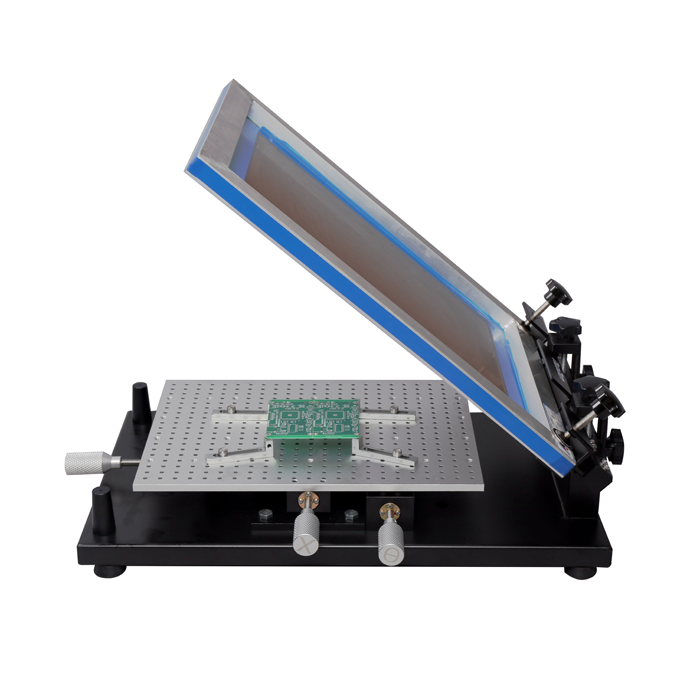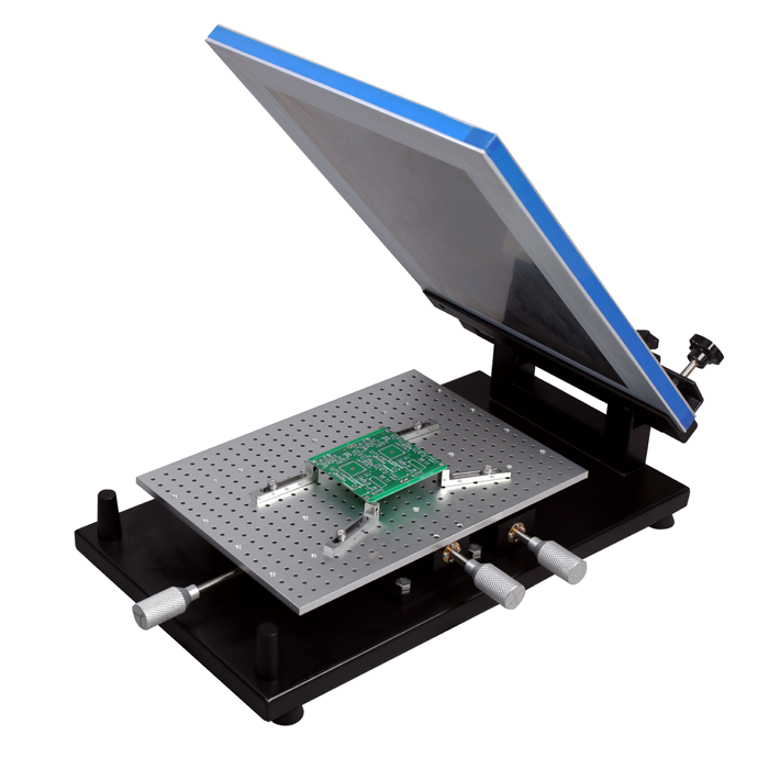 The FP2636 Manual Solder Printer for Framed Stencils is a simple way to apply solder to your PCBs every time. Proper solder application is frequently overlooked as a critical step in the SMD process. Without careful control of the placement and thickness of the solder paste, the results of reflow soldering can be amateur at best, to nonfunctional at worst. The operation of the printer is simple. First, clamp a framed stencil (available at very low cost from most PCB manufacturing houses) into the printer. Then, place the PCB on the included locator fixtures. Using the Vernier controls, move the PCB fixture until the solder pads perfectly align with the holes. Finally, move the solder over the stencil with the squeegee blade (included).